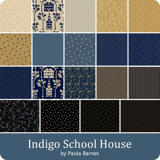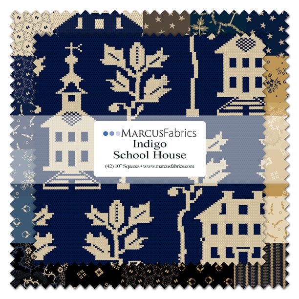 This charming fabric collection features 10-inch squares with a delightful schoolhouse theme, perfect for quilters and crafters alike. The design showcases a rich indigo background adorned with white illustrations of schoolhouses, trees, and other educational motifs, creating a nostalgic and educational vibe. The intricate patterns and high-quality cotton make this fabric ideal for a variety of projects, from quilts to home decor, bringing a touch of vintage charm to any creation.