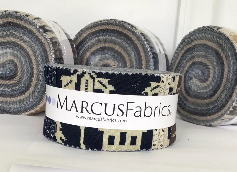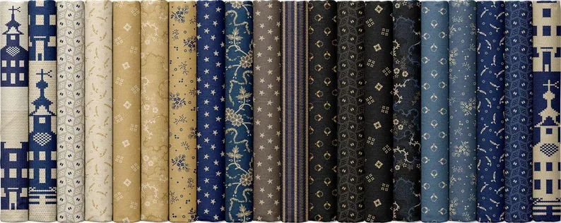 This fabric collection features 2.5-inch strips of 100% cotton, designed in the charming "Indigo Schoolhouse" theme. The roll showcases a variety of patterns including intricate geometrics, delicate florals, and whimsical stars, all in a palette dominated by shades of indigo, navy, and gold, providing a rich, vintage schoolhouse aesthetic perfect for quilting, crafting, or sewing projects that require a touch of nostalgia.