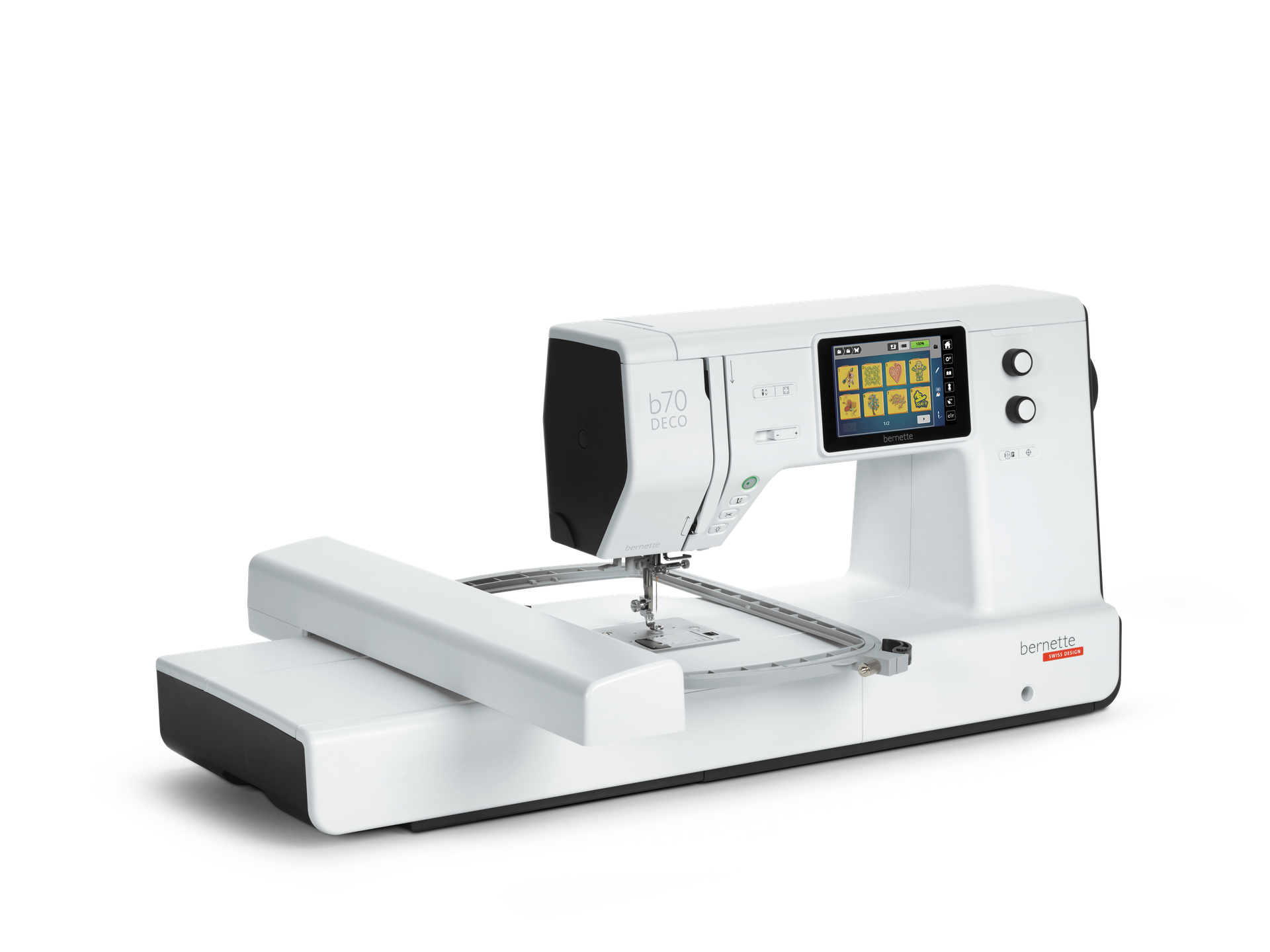 When embroidering, the right thread tension is essential. For some materials, such as lightweight or thin fabrics, it's good to individually adjust the presser foot pressure and the thread tension. Your bernette 70 DECO offers these practical features. Voluminous projects can be challenging, but with the included hopper embroidery foot the stitches turn out beautifully.Even more convenience