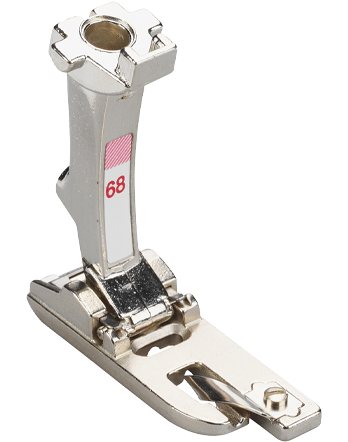 A scroll on the foot feeds the fabric edge from the front and turns it under twice, all in one operation. This produces a narrow, sturdy hem, which in combination with the corresponding stitch type creates the popular scalloped (or shell) hem. Roll and Shell Hemmer #68 is equipped with a 2 mm wide guide.
