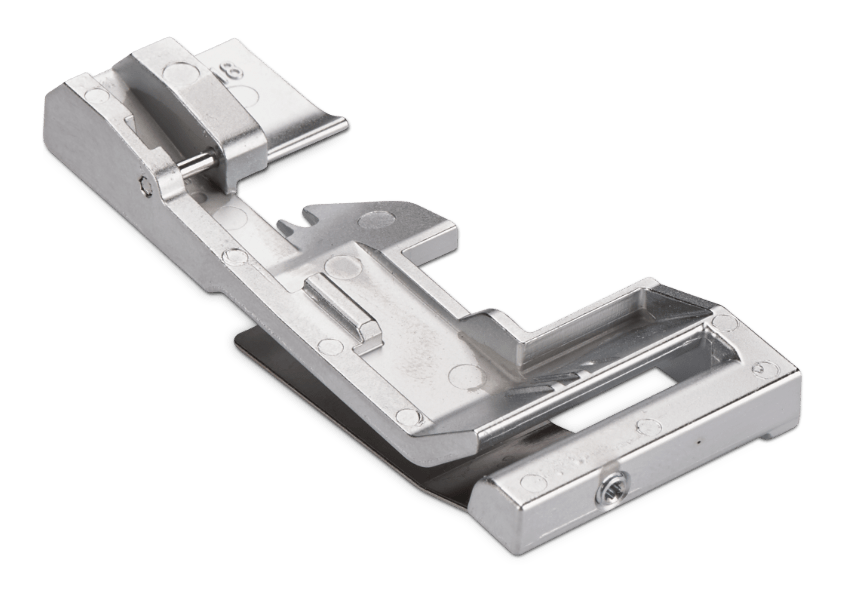 The fabric to be gathered is positioned underneath the Gathering Attachment, whilst the fabric that remains flat passes over it. The fabric is gathered by differential feed at the same time as it is sewn onto the flat fabric.