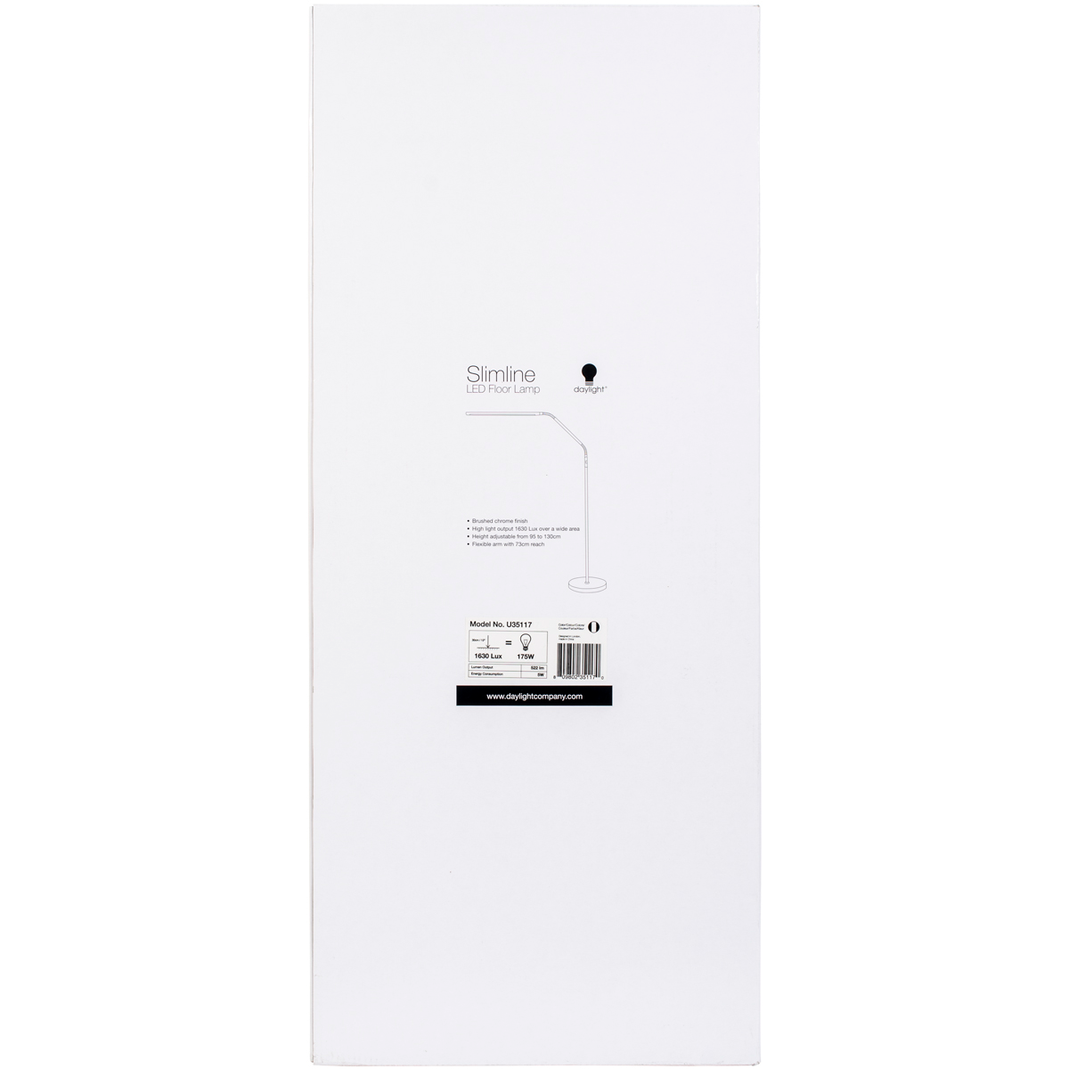 Daylight-Slimline LED Floor Lamp: Brushed Chrome. The perfect addition to your everyday living space or for your craft room! This package contains one LED floor lamp that adjusts in height from 37- 1/2 inches to 51-1/8 inches, has a high light output of 1630 Lux over a wide area and has a flexible arm with a 28-3/4 inch reach. Requires a 175W light bulb. Imported.